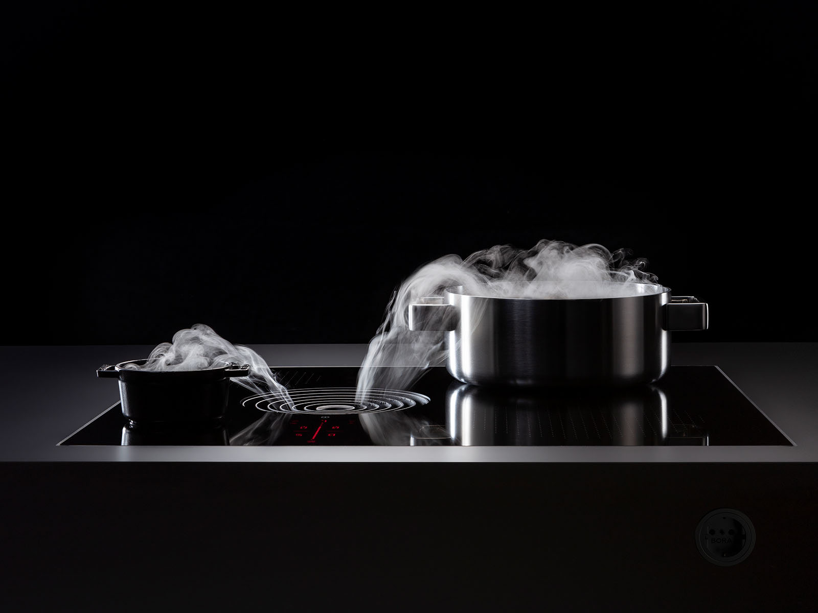 BORA cooktops combine an induction or surface cooking area with a built-in extractor that pulls steam and odours directly down through the centre of the unit. Instead of rising into the room, the air is drawn away immediately at the source.