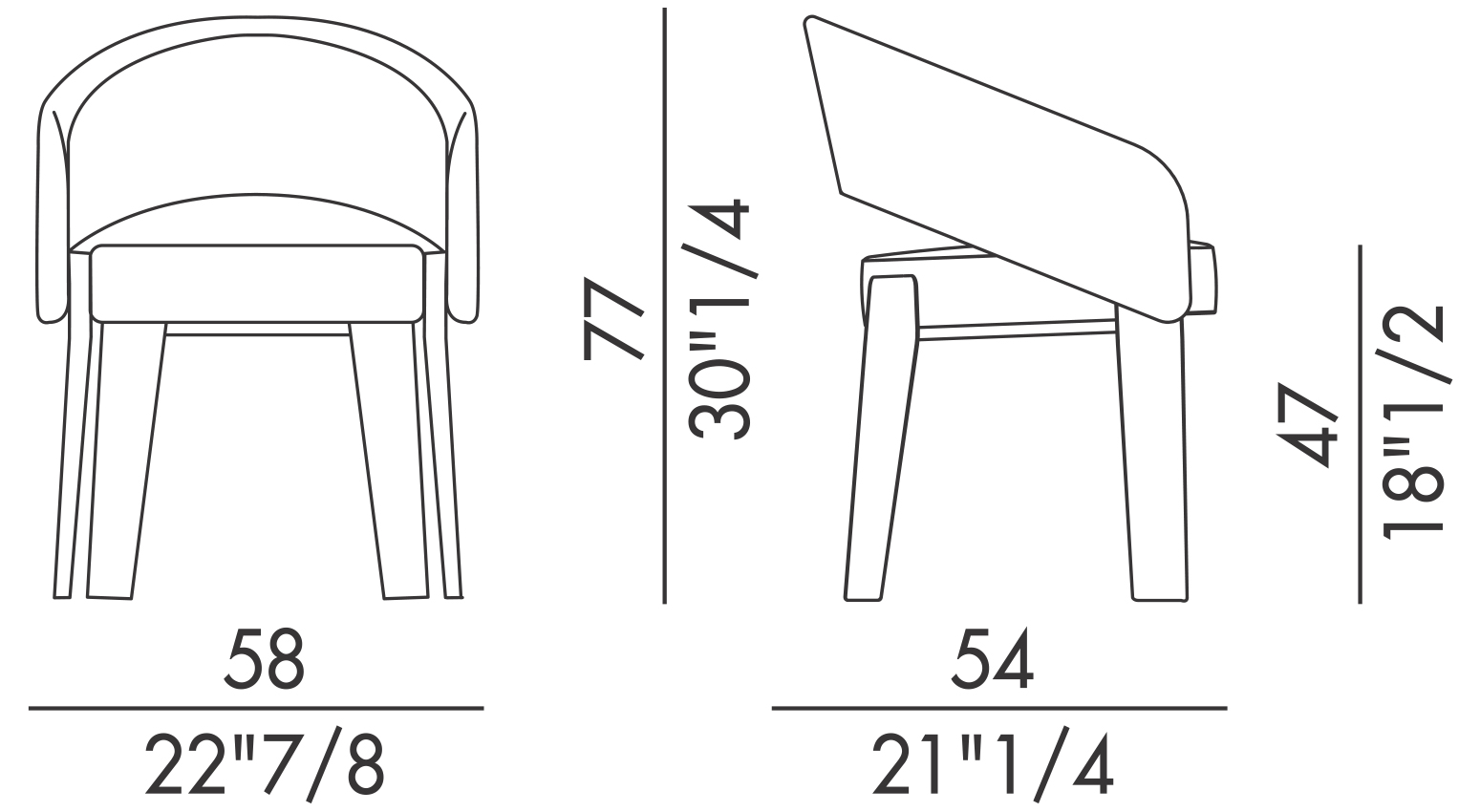 Its signature detail lies in the wooden legs that flow seamlessly into the seat and armrests, which then curve into a semicircular backrest that wraps and supports.