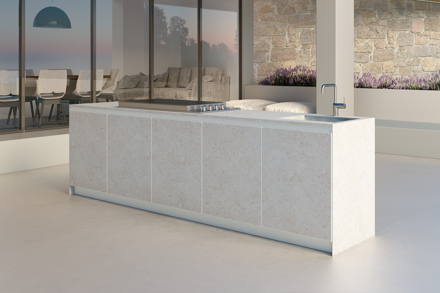 Our modern outdoor kitchen composition K3 showcasing Dekton® by Consentino. Dekton® is a highly-versatile weather resistant porcelain coupled with modern concrete effect aesthetic, available in a variety of colours and finishes. This kitchen is available in a wide variety of layouts, this layout merely showcases the Dekton® Concrete effect finish. Contact our design team for a design specific to your needs.