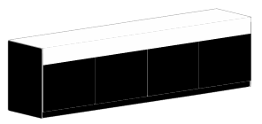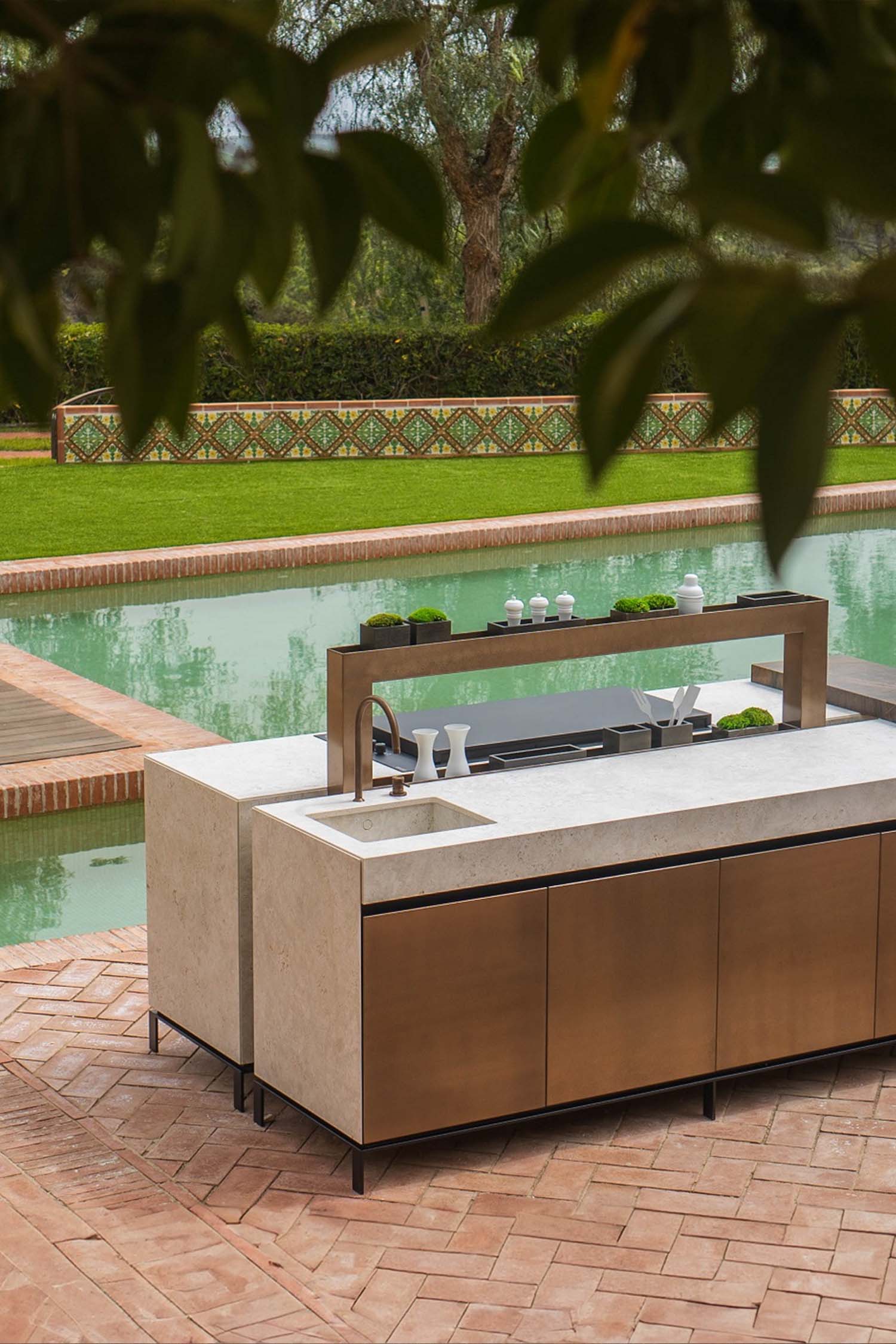 Vertical view of a sleek, contemporary outdoor kitchen console unit designed for a luxury patio or garden space.